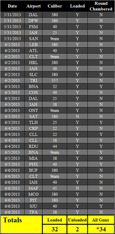 34 Firearms Discovered This Week –Of the 34 firearms, 32 were loaded and 10 had rounds chambered. See a complete list and more photos at the bottom of this post.