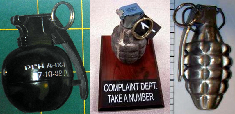 Inert Ordnance and Grenades etc. - We continue to find inert hand grenades and other weaponry on a weekly basis. Please keep in mind that if an item looks like a realistic bomb, grenade, mine, etc., it is prohibited - real or not. When these items are found at a checkpoint or in checked baggage, they can cause significant delays in checkpoint screening. I know they are cool novelty items, but you cannot bring them on a plane. Read here and here on why inert items cause problems.