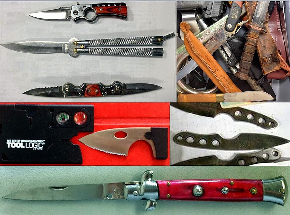 | (Left to Right - Top to Bottom) Three Knives (PHL), Multiple Knives (BWI), Credit Card Knife (BWI), Throwing Knives (SAN), Switchblade (BWI) |