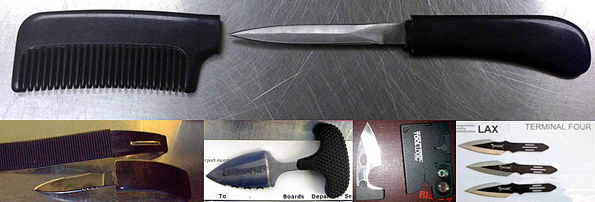 | (L-R) Comb Knife (DTW), Belt Buckle Knife (MCI), Push Dagger (SEA), Credit Card Knife (EWR), Throwing Knives (LAX) |
