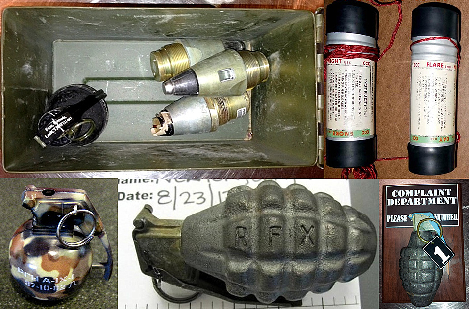 A live "sting ball" riot control grenade along with two inert M762A1 fuses and an additional inert M782 fuse were discovered in an ammo can in checked baggage at John Wayne (SNA).