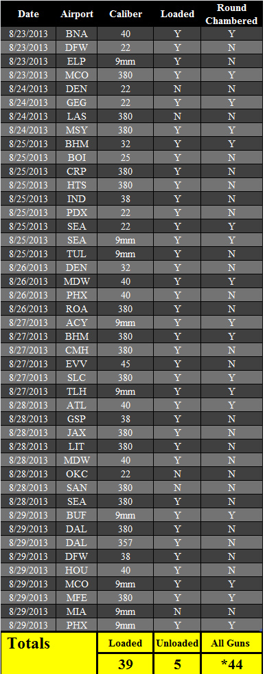 | Guns Discovered at (L-R) DFW, PHX, BHM, BNA, CMH, MCO, MDW, HTS, JAX |