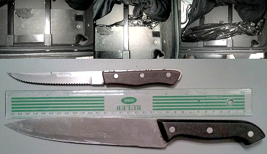 - An 8-inch knife and a 6-inch knife were detected wrapped in plastic bags under a false bottom in a carry-on bag at Guam (GUM).