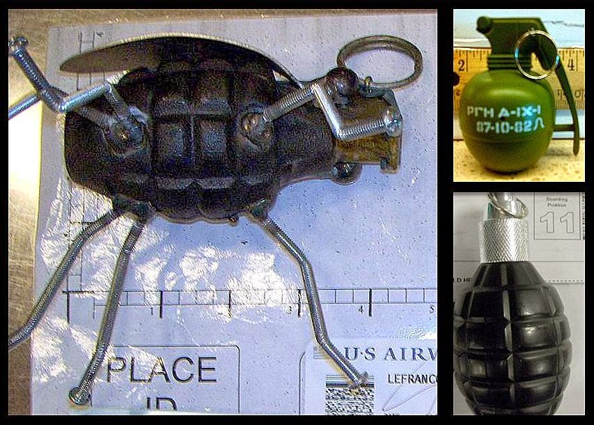 Inert Ordnance and Grenades etc. - We continue to find inert hand grenades and other weaponry on a weekly basis. Please keep in mind that if an item looks like a realistic bomb, grenade, mine, etc., it is prohibited. When these items are found at a checkpoint or in checked baggage, they can cause significant delays because the bomb squad or explosives detection professionals must come to resolve the alarm to determine they're not a threat. Even if they are novelty items, you cannot bring them on a plane. Read here on why inert items cause problems.