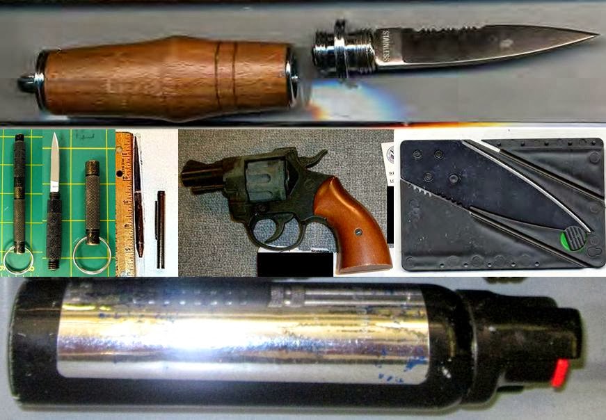 | Top - Bottom / Left - Right: Key Chain Knife (ABQ), Key Chain Knife (CAK), Pen Knife (SJC), Starter Pistol (JAX), Credit Card Knife (ABQ), Bear Mace (OMA). |