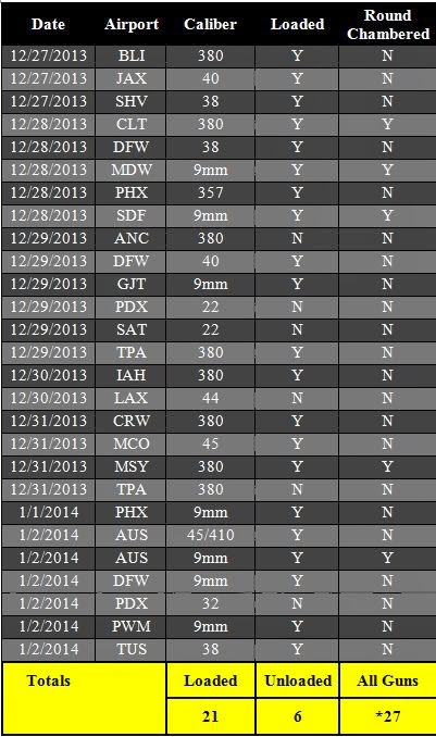 27 Firearms Discovered This Week – Of the 27 firearms, 21 were loaded and five had rounds chambered. See a complete list and more photos at the bottom of this post.