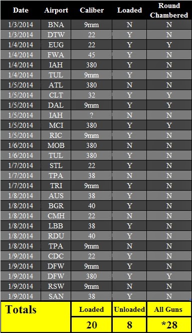 28 Firearms Discovered This Week – Of the 28 firearms, 20 were loaded and five had rounds chambered. See a complete list and more photos at the bottom of this post.