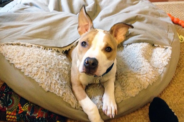 Timmy now lives with Brian and Nadine in Maryland, where he is safe, happy and well-fed. “These dogs show amazing resiliency and forgiveness after being treated so poorly. They just want to be loved,” says Brian. Timmy spends his days snuggling with his family, snoozing in his “pita pocket” bed, playing tug-of-war with the neighbor’s Mastiff, and letting out his puppy energy— energy that at one time was restricted to a heavy collar and chain.