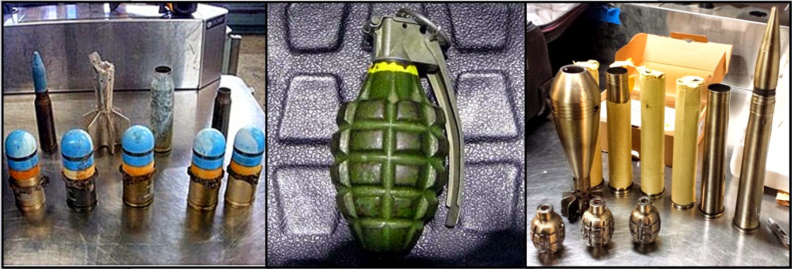 - Three hollowed out replica grenades, six brass projectile cartridges, one hollowed out replica mortar, and one hollowed out replica 30mm projectile were discovered in a checked bag at San Francisco (SFO).