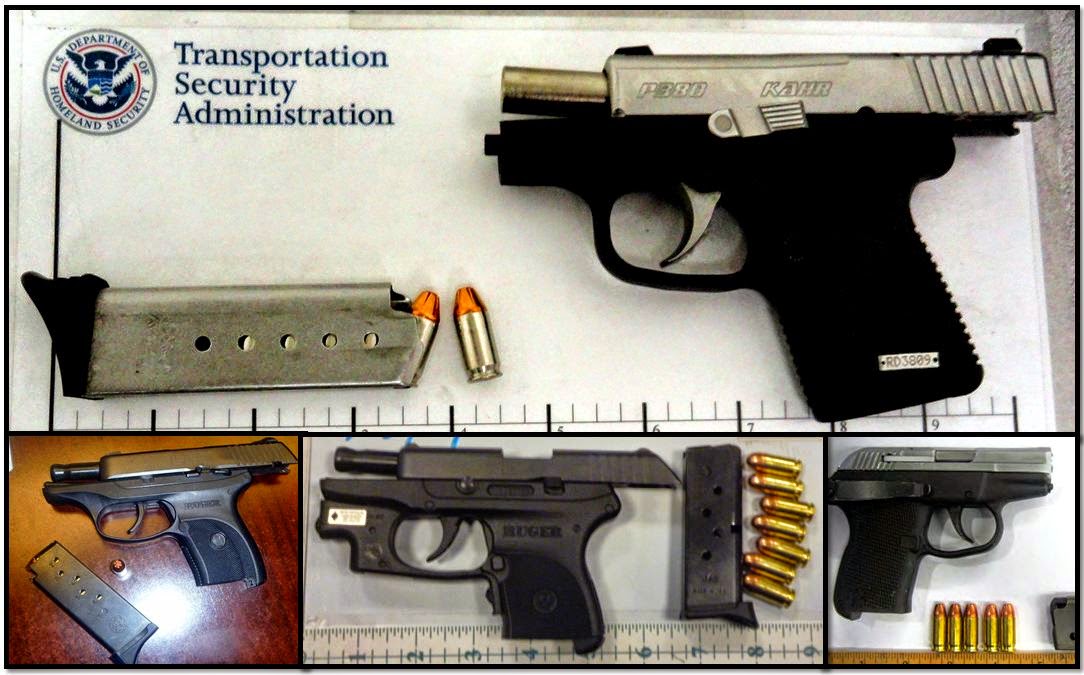 | (Clockwise from top left) Loaded Firearms Discovered in Carry-on Bags at: RNO, DAL, FLL & AUS |