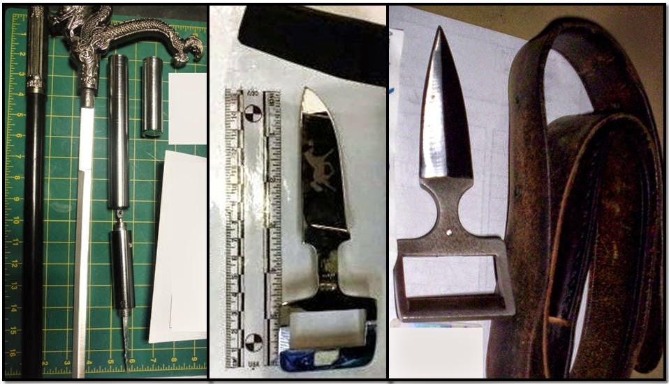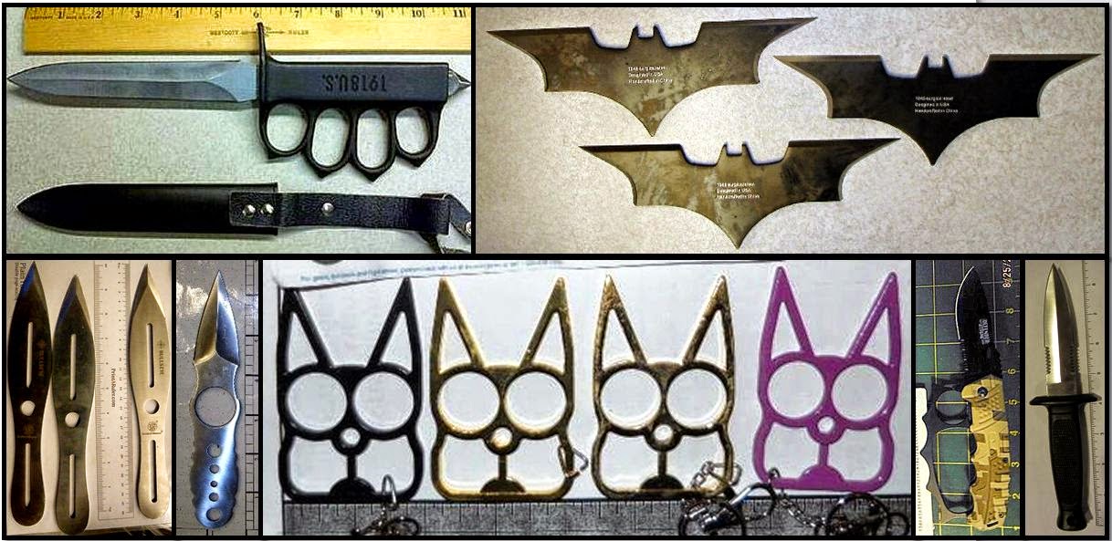 | (L-R) Cane Sword and Nunchucks (LAS), Belt Buckle Knives (LAX - MCI) |