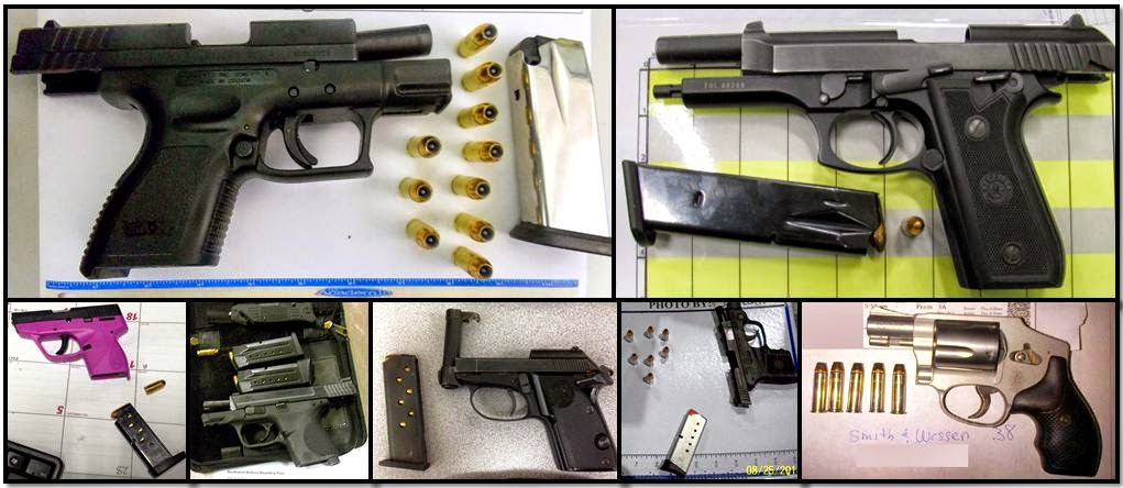 | Clockwise from top left: Firearms discovered at HOU, LAN, BTR, AUS, PWM, PHX, ATL |